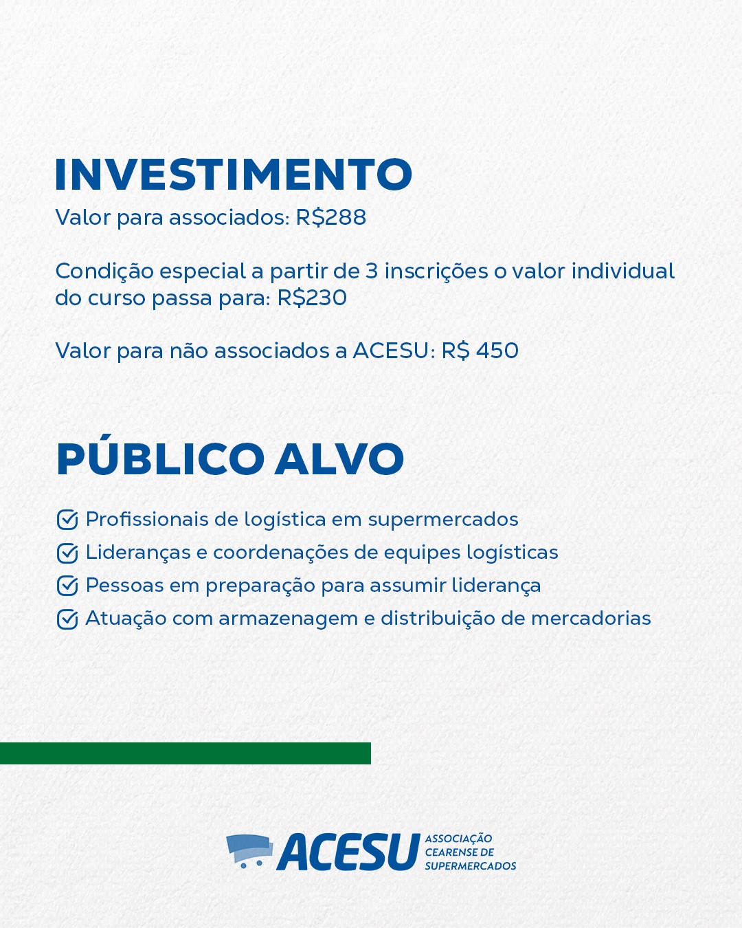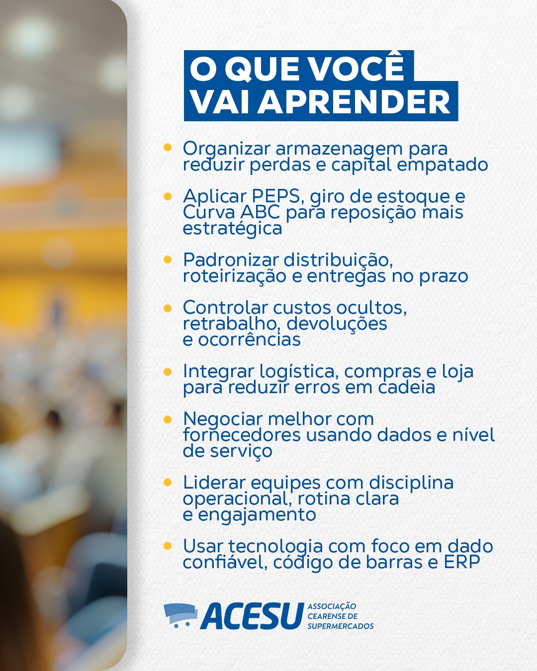 Profissionais ligados à área de logística, que ocupem cargos de liderança ou coordenação de equipes logísticas ou que estejam se preparando para assumir posições de liderança, trabalhe com armazenagem e distribuição de mercadorias do supermercado.
