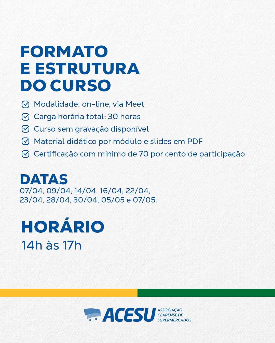 Datas e Horário das aulas – 07/04, 09/04, 14/04, 16/04, 22/04, 23/04, 28/04, 30/04, 05/05