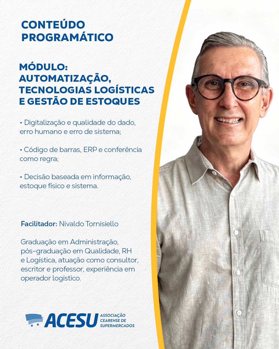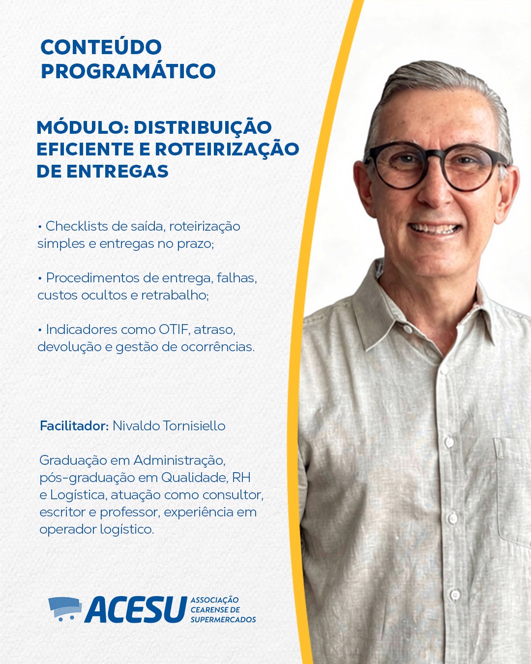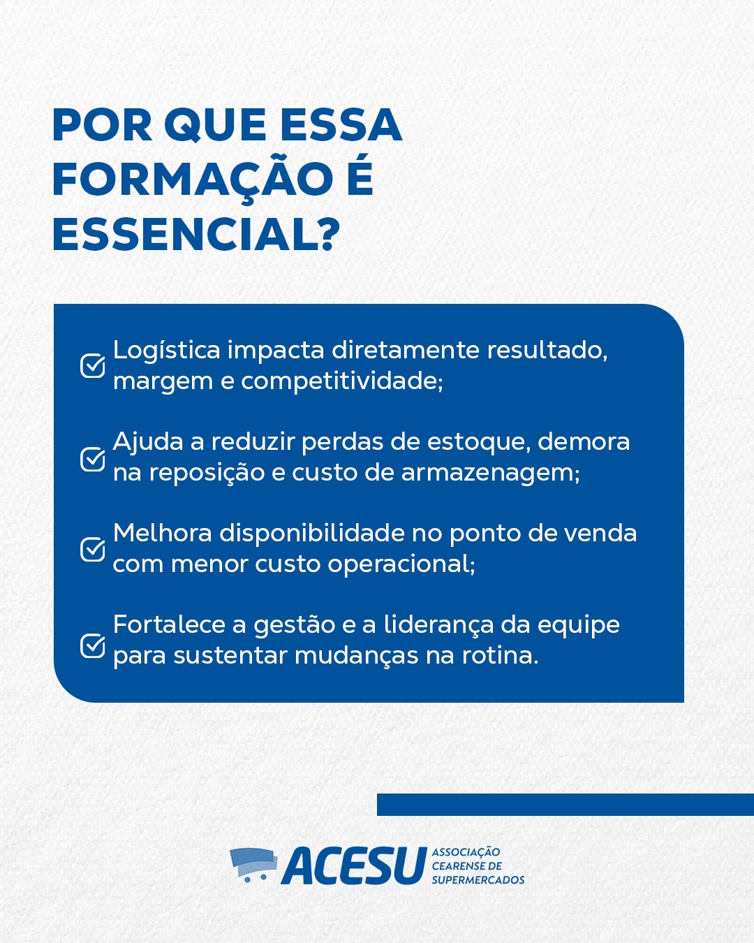 A logística é um fator estratégico para a eficiência operacional dos supermercados, impactando diretamente custos, reposição e resultados. Este curso da Escola ACESU foi desenvolvido para apoiar os associados no aprimoramento da gestão logística, capacitando-os a otimizar processos, reduzir perdas e liderar equipes com foco em maior competitividade no mercado.