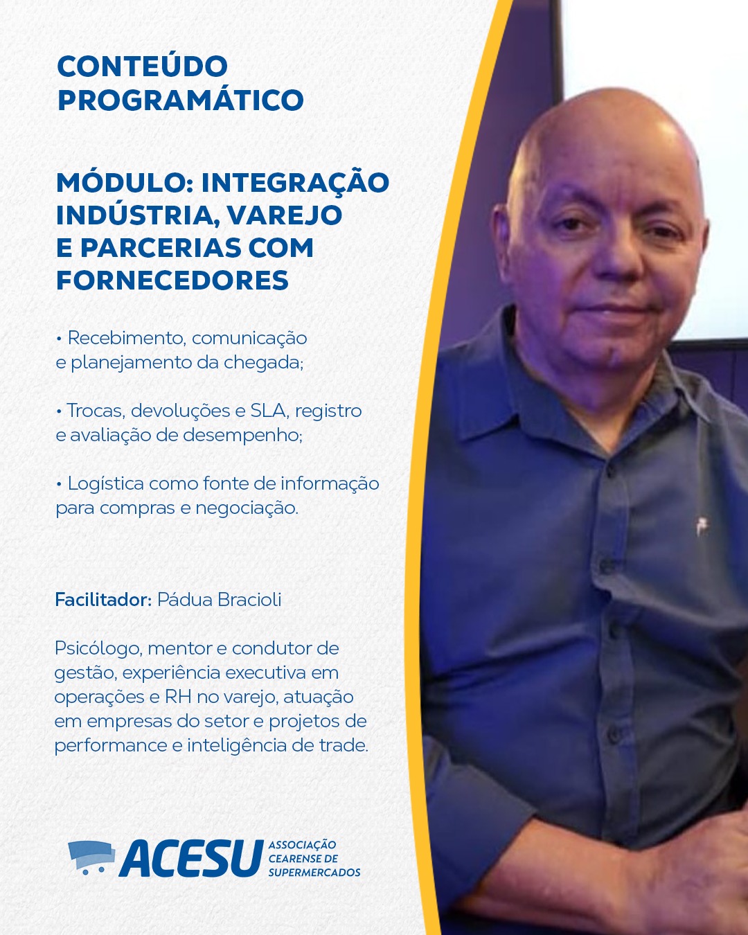 Facilitador: Pádua Bracioli – psicólogo, mentor, condutor de gestão. Ex executivo de operações e Rh com passagens sólidas no GPA, Extra hipermercados, Candia Hipermercados, Grupo Takeda, Farmácias Pague Menos, Grupo Chegue Pague. Sócio Diretor da Vibe de Vendas, Academia de Performance, Shoppertech e a TRIC Trade Retail Inteligence Center.
