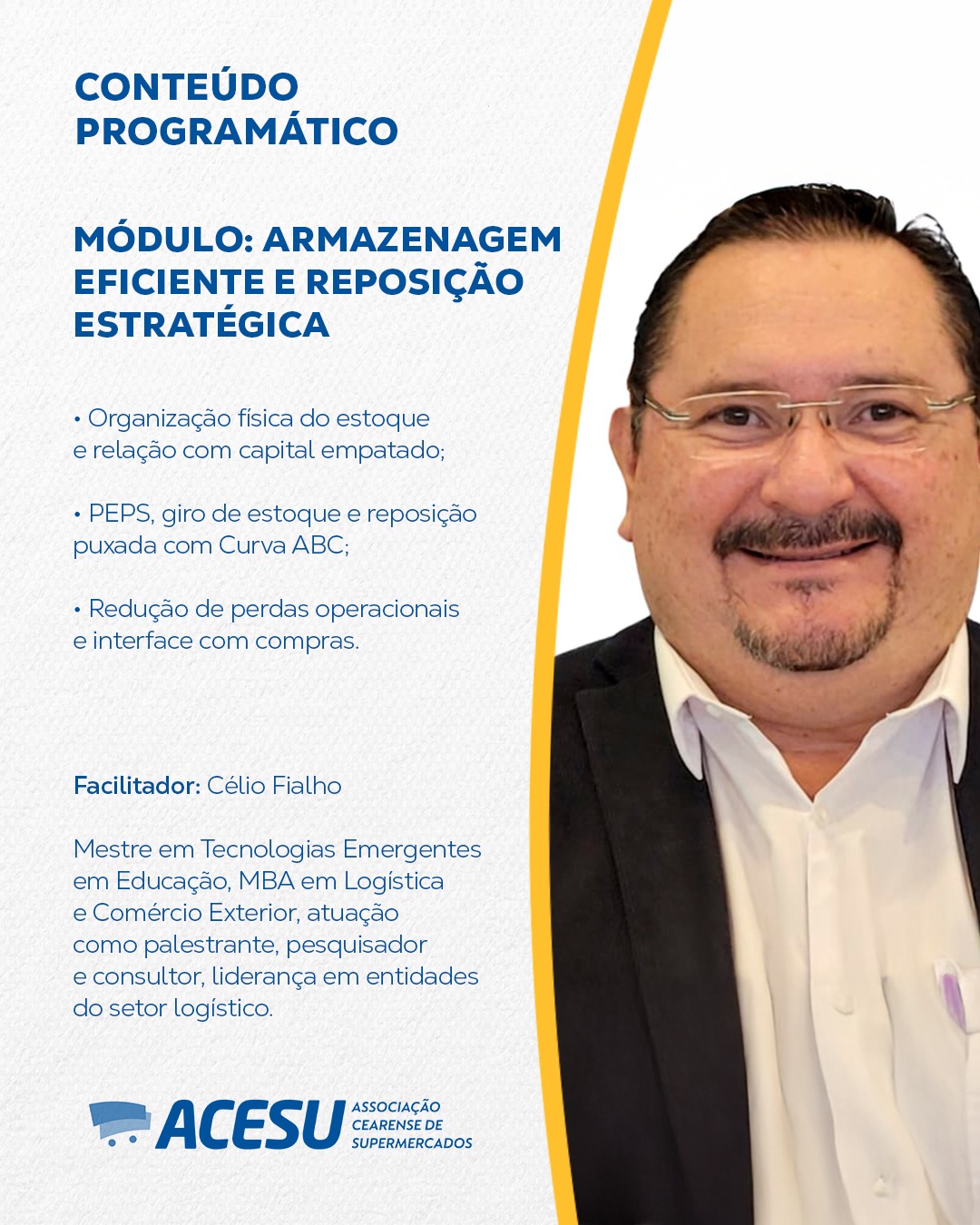 Facilitador: Célio Fialho – Mestre em Tecnologias Emergentes em Educação pela Must University (EUA); MBA em Logística e Comércio Exterior pela ABRACOMEX; Dir. Presidente da AGEL- Associação dos Gestores e Executivos em Logística; Secretário Executivo da Câmara Setorial de Logística – ADECE/FIEC; Palestrante, Pesquisador, Consultor e Lifelong Learning.