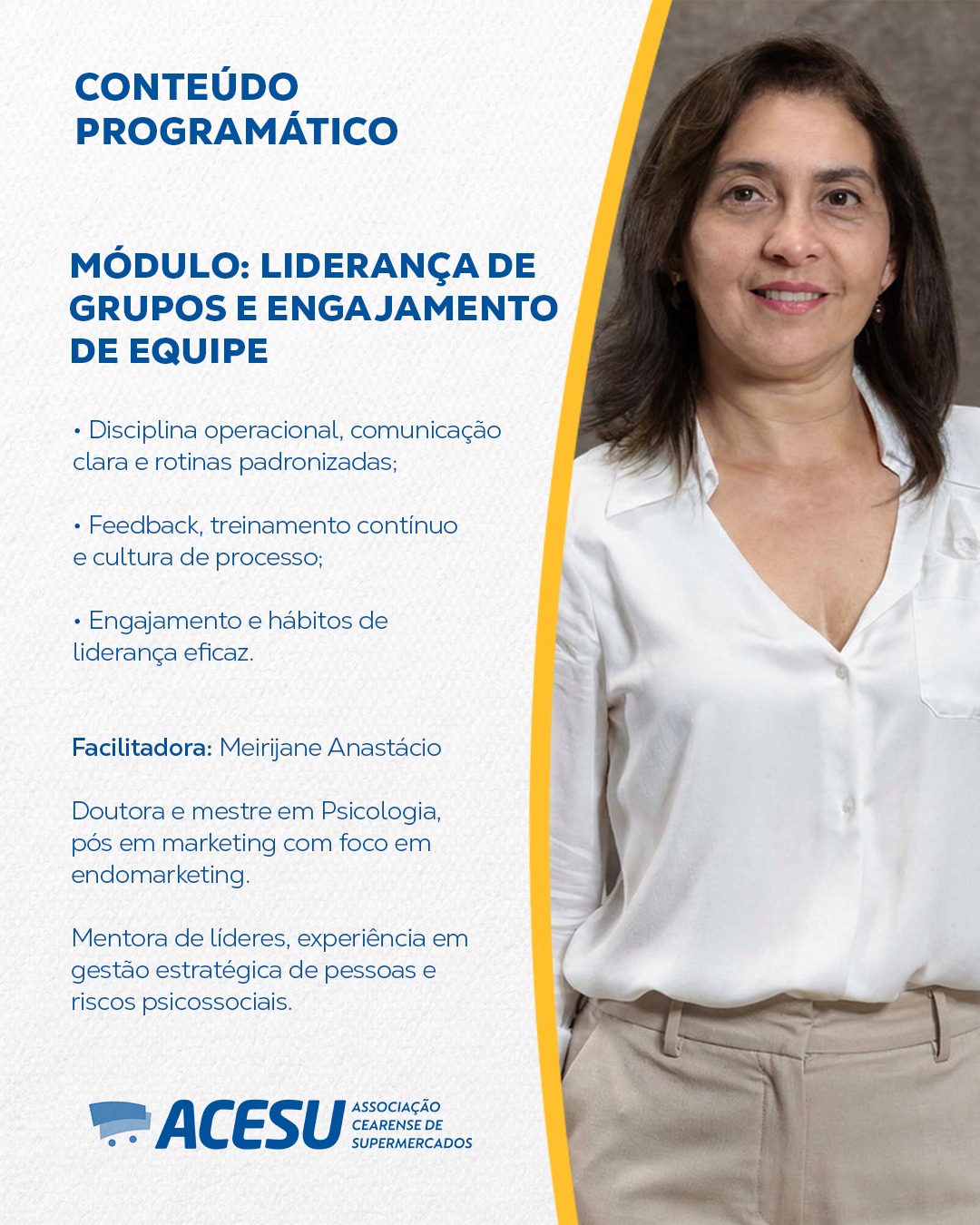 Faciltadora: Meirijane Anastácio – Doutora em Psicologia Social, Mestre em Psicologia com ênfase em equipes, pós-graduada em marketing com foco em endomarketing, mentora de líderes, integradora de gerações e orientadora vocacional e de carreira. Larga