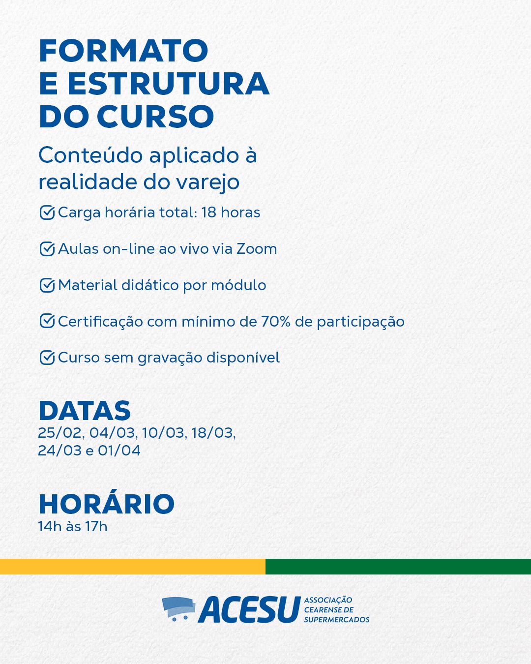 • Datas e Horário das aulas – 25/02, 04/03, 10/03, 18/03, 24/03 e 01/04 – 14 às 17h;